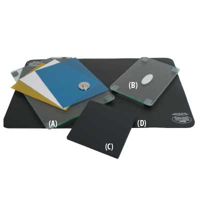 The polishing of fiber optic connectors calls for both a hard flat surface and a cushioned pad. The 9” x 13” or 6” x 9” polish plate is available in safety glass and mounted on four rubber feet for support. When polishing PC style pre-radius connectors, use the soft polish pad on the glass plate. Placing the lapping film over the pad assures the removal of epoxy and proper polish of fiber without destroying the pre-radius of the ferrule.