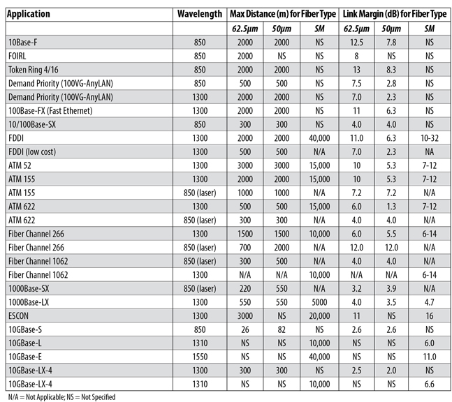 Fiber optic system designers and technicians who install high speed data networks must choose the proper fiber type to ensure that they support the connection speeds required of these networks. The chart below shows specifications for common applications.