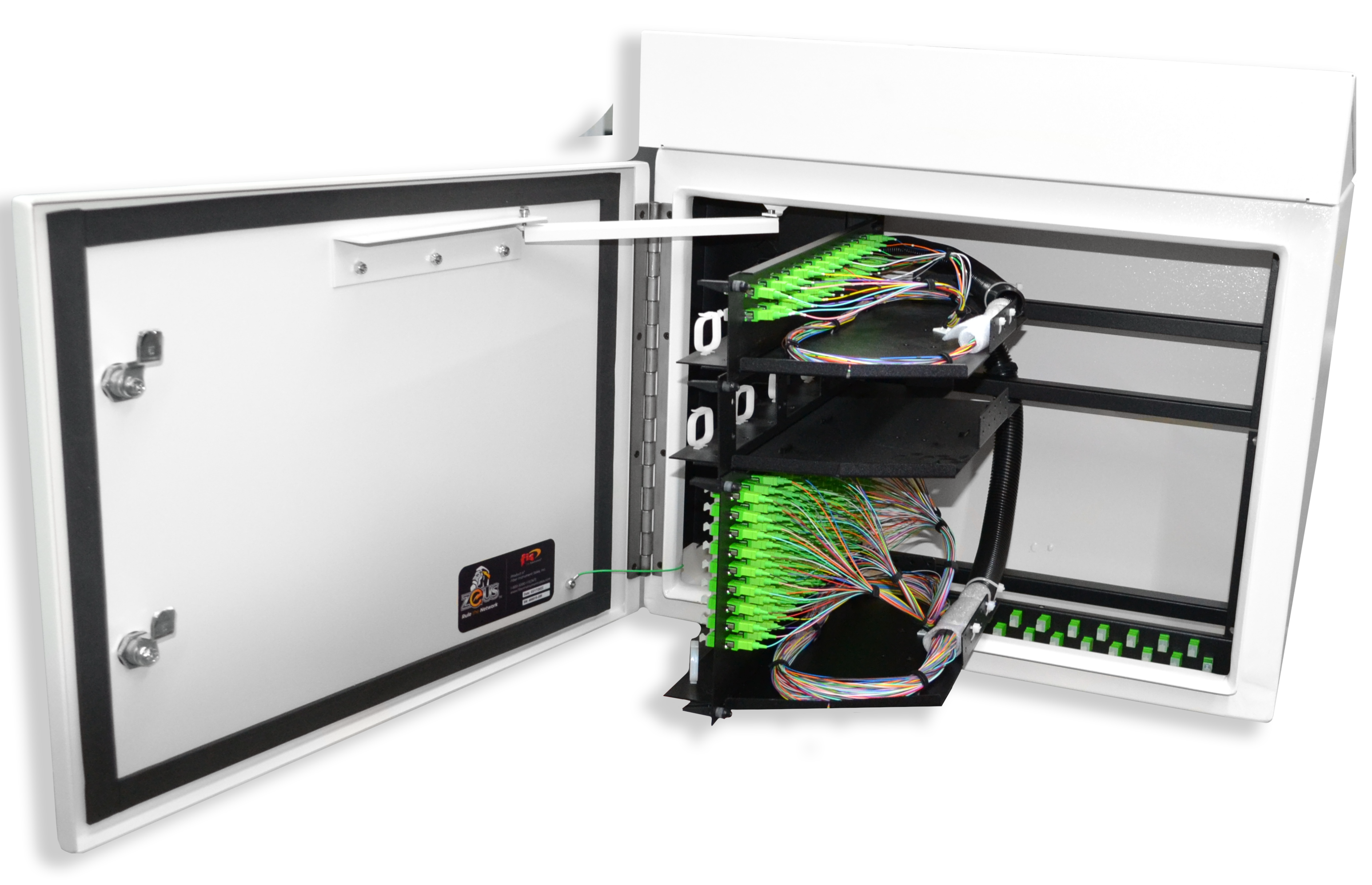 The Fiber Management Center (FMC) is a NEMA-rated, completely passive enclosure designed to interconnect fiber optic cables. The FMC comes in three sizes to accommodate any port size and stores custom-designed LGX footprint High-Density Splitter Modules for any PON architecture. Each cabinet includes a metal template for PAD Mount installation and all pole/wall mounting hardware.