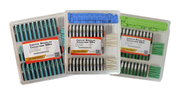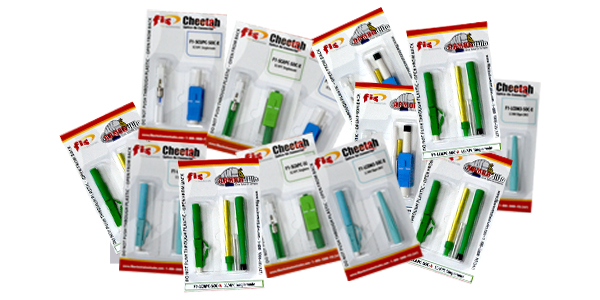 FIS has two offerings of Splice-On Connectors, the Cheetah for 250um and 900um buffered fiber and the Armadillo for 2mm or 3mm jacketed fiber cables. These connectors are manufactured, and quality inspected prior to single or bulk packaging at FIS.